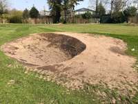 Er wordt hard gewerkt om de baan uitdagender en mooier te maken. In deze update een impressie van de bunkers in aanleg; op hole 7 een nieuwe bunker, de oude vervalt; een nieuwe bunker links van hole 8 en een nieuwe bunker achter hole 9 (voorheen afslagplaatsen).